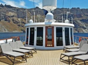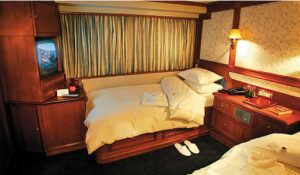 The category B cabins are located on the lower and main deck offering oversized twin port holes (lower deck) or double windows (main deck), bathroom with marble floors as well as Glass and Corian showers. 7 of the 10 cabins offer flexible bedding configuration. The cabins are equipped with individual controlled A/C, TV with DVD player, mini fridge, safe deposit box, deluxe toiletries and bathrobes and they all have WIFI at a charge.