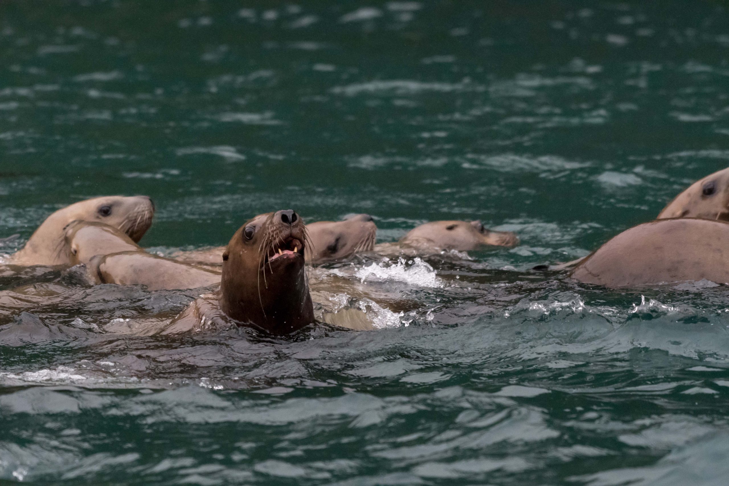 A group of Steller sea lions swimming off the coast of Alaska